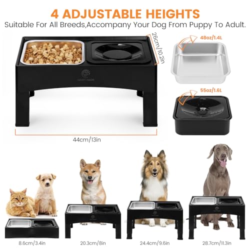- 🐶Le support de gamelle pour chien est conçu avec quatre réglages de hauteur ajustables : 9 cm, 20cm, 24cm et 28cm. Vous pouvez facilement ajuster la hauteur en fonction de vos besoins et des scénarios d’utilisation sans avoir besoin d’outils.