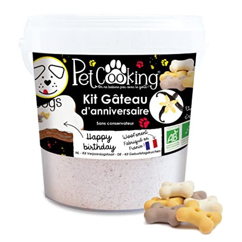 - RÉALISEZ DES GÂTEAUX UNIQUES – L’anniversaire de votre toutou arrive, préparez lui un superbe gâteau d’anniversaire avec cette préparation pour gâteau à la vanille et décorez-le à l’aide des petites friandises déco fournies dans le kit. Pratique et rapide pour des gâteaux maison faits en un clin d’œil ! Votre animal de compagnie va se régaler ! PRÉPARATION BIO – 1 préparation bio 350 g pour confectionner un gâteau. Avec PetCooking on ne babine pas avec le goût ! Et en plus il y a que du bon dedans, des ingrédients bio fabriqués en France ! Sans conservateurs, sans additifs et sans colorants. Aliment complémentaire pour animaux.