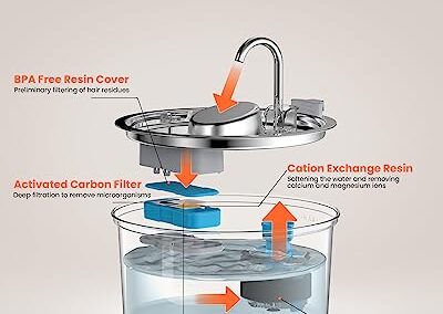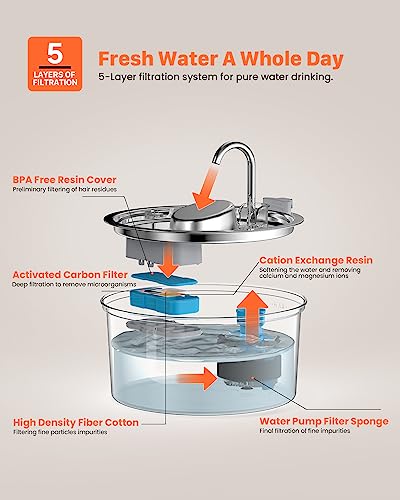 - 【De l’eau fraîche à tout moment】Ce distributeur d’eau pour animaux de compagnie garde l’eau fraîche grâce à un système de recirculation et un système de filtration en 5 étapes qui comprend une couche de charbon actif et de coton en coquille de noix de coco, une résine échangeuse d’ions et un tissu non tissé épais pour éliminer les contaminants et rendre l’eau plus savoureuse et plus sûre pour les animaux de compagnie.