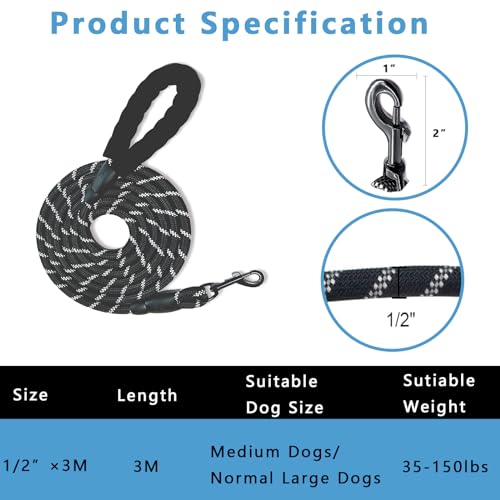 alouweekuky Laisse Chien,3m/1.2cm Grand Longe pour Chien,RéFléChissant Laisse pour Chien Solide Convient Aux Chiens De Taille Moyenne Et Grande(Noir,3m)