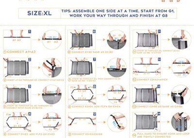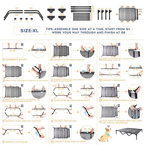 - Utilisation en extérieur et en intérieur : ce lit d’extérieur pour chien est facile à monter et à démonter, joint d’étanchéité, pas besoin d’installer des vis. Vous pouvez le transporter facilement et remplacer le filet Teslin selon vos besoins. Remarque : le lit pour chien doit être installé dans l’ordre spécifié dans les instructions (français non garanti)