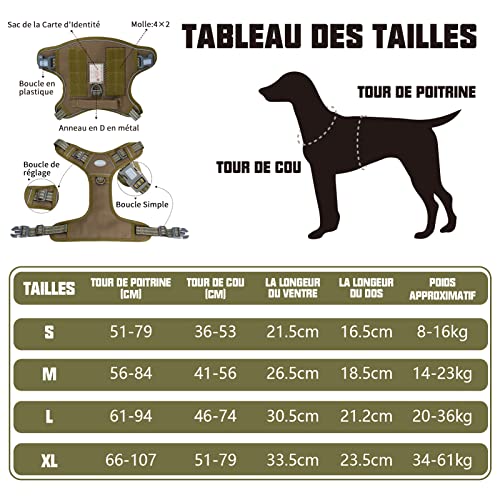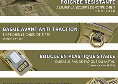 - 【Harnais de Chien Anti Traction】:Notre harnais tactique chien a 2 anneaux en forme D sur la poitrine et le dos. Une fois votre chien se précipite en avant, vous pouvez tirer l’anneau de poitrine pour le contrôler. Quand vous marchez avec votre chien, l’anneau sur le dos assure moins stress sur le cou du chien.