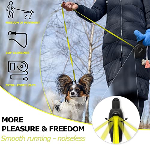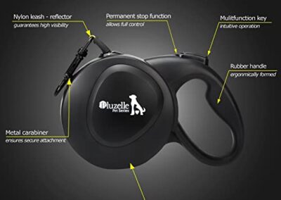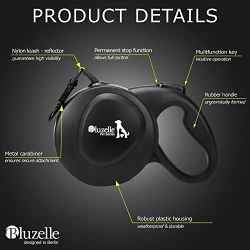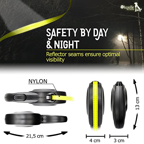 BLUZELLE Laisse pour Chien Grands jusqu’à 50kg, 8m Longue Longe Chien, Enrouleur de Sangle avec Jaune Bande Lumineux et Mousqueton 360° Métal, Frein de Rétraction, Poignée Ergonomique, Noir