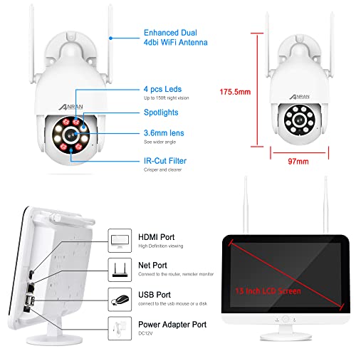 [Caméra avec Lumière] ANRAN 5MP Kit Caméra de Surveillance WiFi Extérieur, 8CH Système de Caméras de Sécurité sans Fil avec 13″ Moniteur avec 4 Caméras Dôme Pivotant à 360, Fonction Intercom, 2TB HDD