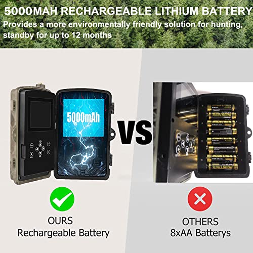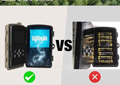 - 📶【Batterie rechargeable révolutionnaire】– Cette caméra de chasse dispose d’une batterie intégrée de 5000 mAh pour une autonomie plus longue. Par rapport aux autres caméras de chasse qui utilisent des piles AA, elle réduit la consommation de piles, est plus respectueuse de l’environnement et a une autonomie de 12 mois. Vous pouvez donc économiser beaucoup d’argent à long terme.