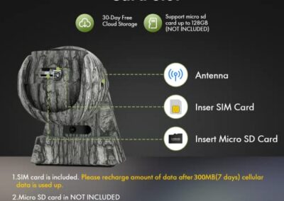 • 【4G Connectivité sans Fil & Alimentation Solaire】La caméra de chasse est connectée à Internet par le réseau cellulaire 4G, ce qui permet de visionner et de télécharger des vidéos à distance. Il n’est pas nécessaire d’aller dans la nature et d’enlever la caméra fréquemment. Equipée d’un panneau solaire et d’une batterie intégrée de 8000mAh, la caméra peut fonctionner 365 jours après avoir été complètement chargée. L’emballage de la caméra comprend une carte SIM préchargée avec 300 Mo de données.