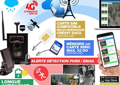 - Caméra solaire de chasse HD 4G LTE GSM waterproof IP66 longue autonomie « »3 ANS » », Alerte en temps réel et envoi de photo et vidéo HD sur Server cloud « »apps ios & android » » ou PC; sur serveur FTP, par email