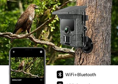 • 【Connexion WiFi pour Un Partage Facile Des Fichiers】Grâce au WiFi de la caméra chasse, vous pouvez visualiser le contenu directement dans l’application et télécharger des vidéos et des photos sur votre téléphone sans avoir à retirer la camera chasse solaire de l’arbre. Réglez facilement les paramètres, l’angle de l’objectif, le partage des médias sociaux, etc. via votre téléphone. (Avis: la connexion WiFi est limitée à 10m.)