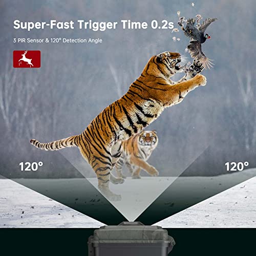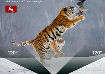 - 【Vitesse de Déclenchement Rapide】La caméra de chasse est équipée de trois capteurs PIR pour améliorer la sensibilité. La portée de détection est de 20m et un angle de détection de 120°. Dès que l’animal (le corps humain) se trouve dans la zone de détection, elle déclenche la prise de vue dans les 0,1s sans délai. Vous ne manquerez jamais aucun moments passionnants même à la tombée de la nuit.