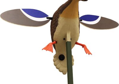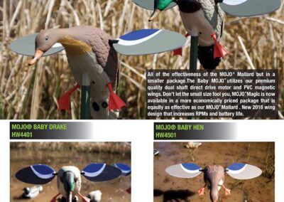 Le Baby Mojo a été conçu pour permettre aux chasseurs de tout horizons de bénéficier de l’incroyable effet d’attraction des formes à ailes tournantes motorisées. Embarqué dans une blette de femelle canard colvert de taille moyenne, le mécanisme, silencieux, fonctionne à l’aide d’une batterie de 6 volt fournie, bien évidemment accompagnée de son chargeur. Le Baby Mojo est livré avec un piquet démontable en 3 parties. Les ailes sont fabriquées en plastique, légères, elles offrent un mouvement rapide et fluide sans consommer fortement sur la batterie.