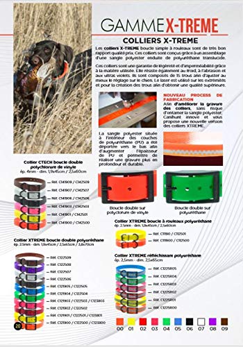 - Grâce à leur composition, les colliers XTREME sont léger et imperméable. Ils sont conçus pour résister au froid, à l’abrasion ainsi qu’aux ultras violets. Les colliers boucle double de la gamme XTREME sont composés de sangle polyester enduite de polyuréthane translucide.