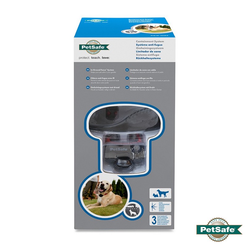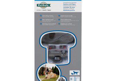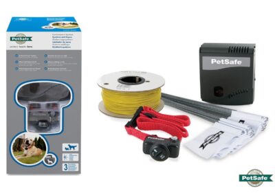 Le système de clôture anti-fugue pour chien PetSafe Radio Fence PRF-3004W-20. Le collier s’adapte aux tours du cou allant de 15 à 66 cm, Convient aux chiens de 3,6 kg et plus.