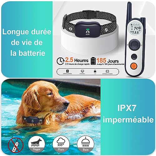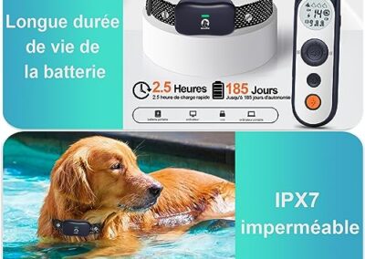 - 【Longue autonomie de batterie & étanche IPX7】La clôture électrique sans fil pour chien, rechargeable, offre une longue autonomie de batterie, avec un temps de veille pouvant aller jusqu’à 185 jours (Si la fonction de la clôture électronique est activée, elle peut être utilisée pendant environ 85 heures.)Le collier de dressage pour chiens est étanche IPX7, idéal pour l’entraînement par tous les temps et en tous lieux.