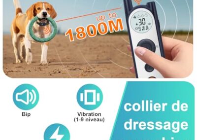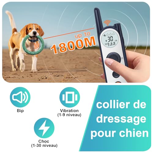 - 【Collier dressage chien diversifié】Le collier electrique pour chien offre 3 modes sécuritaires : Bip, Vibration (1-9 niveaux) et Choc sécurisé (1-30 niveaux). Trois modes d’entraînement différents avec plusieurs niveaux parmi lesquels choisir. Nous vous recommandons de commencer avec un niveau plus bas pour tester le réglage approprié pour votre chien. Une portée allant jusqu’à 1800m vous permet de dresser vos chiens facilement en intérieur et en extérieur.