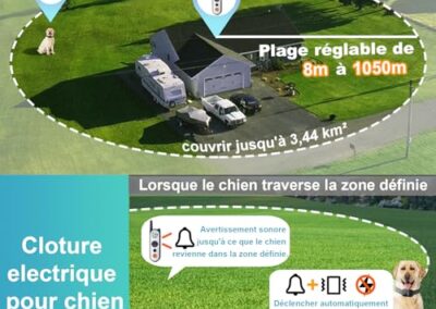 - 【Collier anti-fugue chien sans choc】Pour la sécurité du chien, aucune fonction d’électrochoc automatique n’est prévue.Lorsque le chien traverse la ligne de délimitation fixée, le collier récepteur émet automatiquement un avertissement bip et des vibrations, incitant le chien à faire demi-tour.Si vous avez besoin de choc, veuillez utiliser manuellement la fonction choc de la télécommande.La clôture sans fil propose 14 niveaux de distance ajustable, allant de 8m à 1050m.