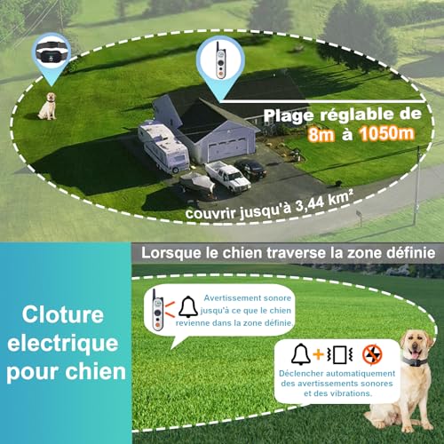 Clôture Électronique pour Chien,8M à 1050M Ajustable Clôture pour Chien,Résistant à L’Eau Collier de Dressage pour Chiens de Moyennes et Grandes