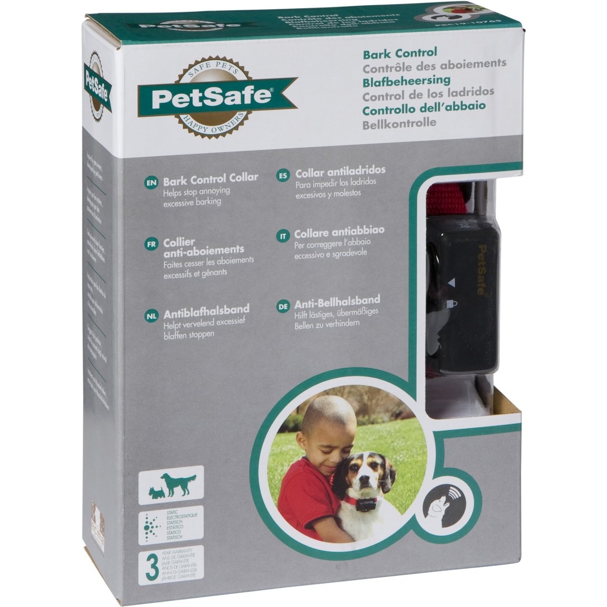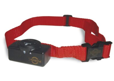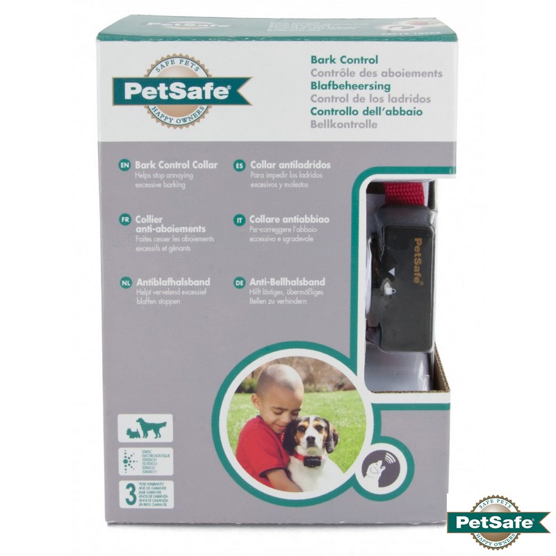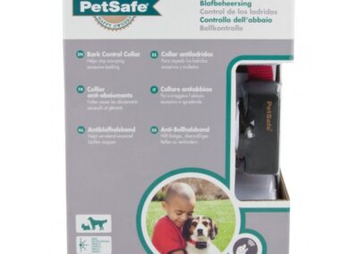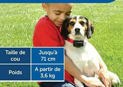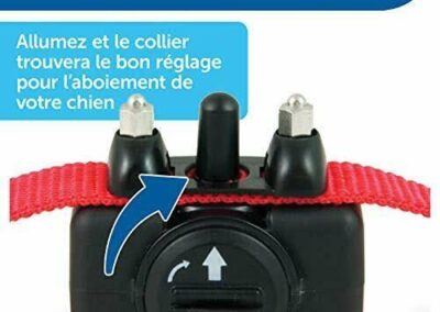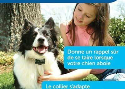 Collier anti-aboiement Petsafe. Etanche et léger (66 g), 6 niveaux progressifs automatiques, ni stress ni douleur pour l’animal, un signal sonore précède la punition, ne nécessite aucun réglage, voyant de pile faible. Le palpeur situé sur le boîtier réagit aux vibrations des cordes vocales du chien en émettant un signal sonore suivi d’une légère stimulation électrostatique suffisamment désagréable pour qu’il arrête d’aboyer. Pour une efficacité maximale, la punition est suffisamment désagréable et intervient en même temps que l’aboiement. Système éducatif ni stressant, ni douloureux car un signal sonore précède la punition.