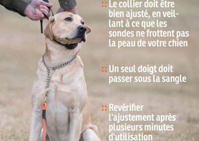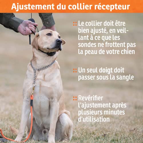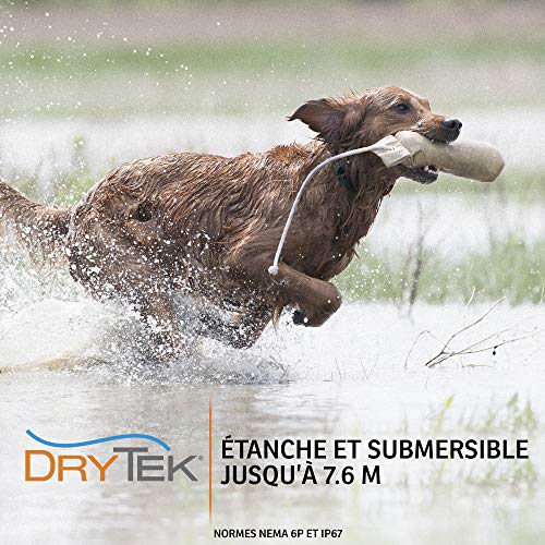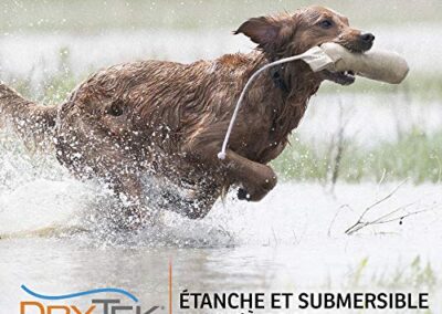 • DRYTEK : Doté de notre technologie DryTek, le collier est étanche et submersible jusqu’à 7,5 m. Le collier récepteur convient aux chiens de 4 kg ou plus avec des tailles de cou de 13 à 55 cm