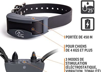 • PORTÉE 450 M: Collier électronique d’une portée de 450m et pouvant être utilisé pour entraîner 3 chiens en même temps grâce au collier émetteur supplémentaire