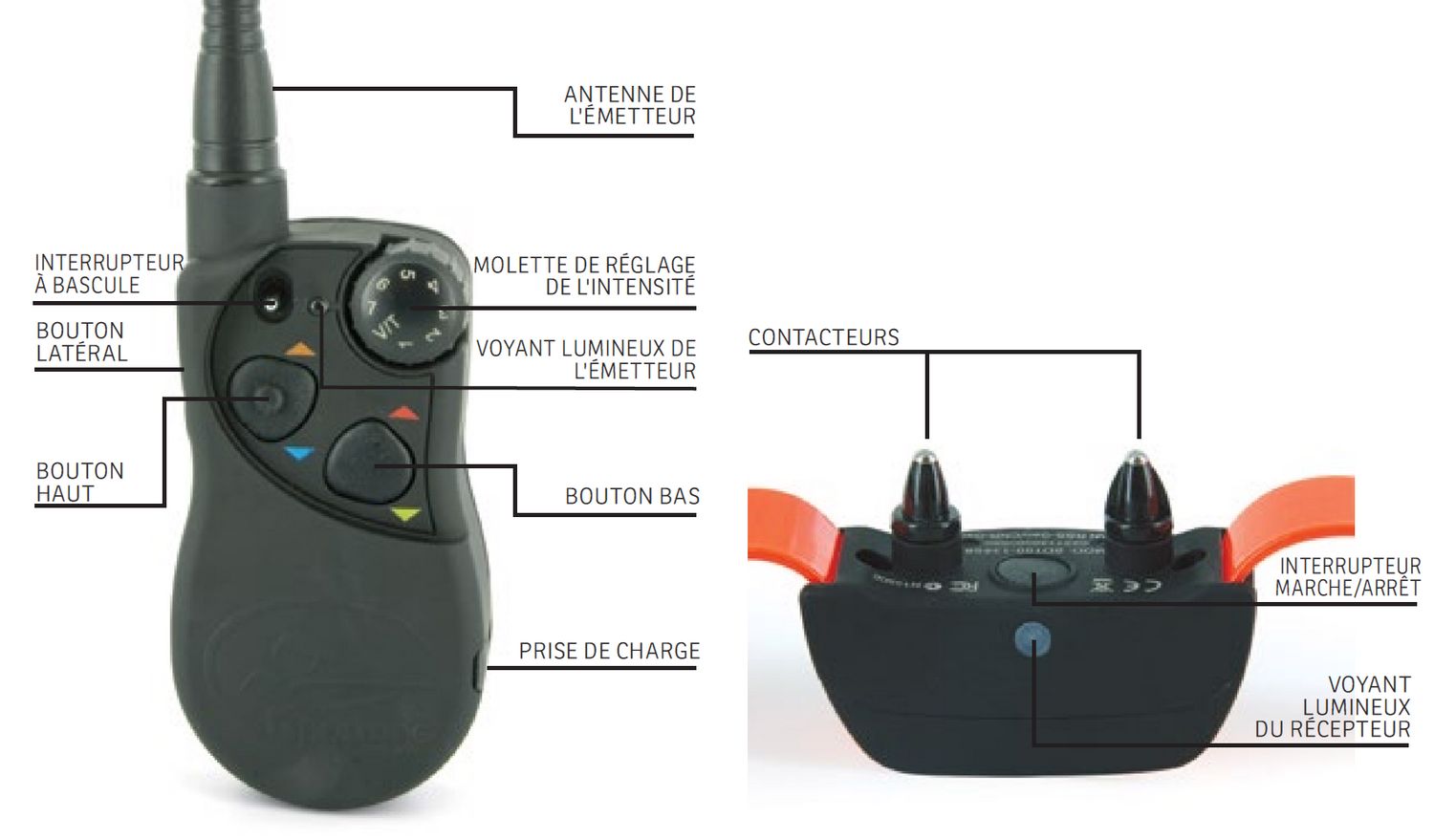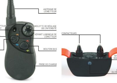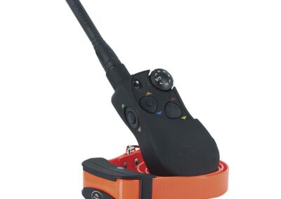 Collier de dressage Peut être utilisé jusqu’à 6 chiens Portée 1600 m Télécommande compacte avec 6 indicateurs colorés 2 plages d’intensité de stimulation 7 niveaux de stimulation continue par plage 14 niveaux de stimulation momentanée par plage 12 modes de programmation de la télécommande 3 modes d’utilisation.