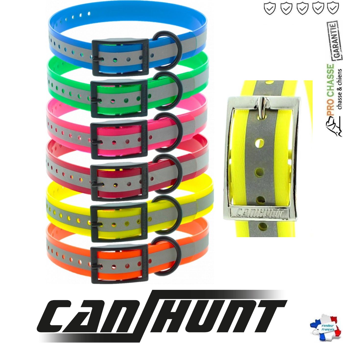 Ces collier sont résistants, conçus pour résister au froid et à l’abrasion. Ils sont équipés de 22 trous ce qui permet un meilleur réglage. Les extrémités ainsi que les trous sont réalisés à l’aide d’un laser afin d’obtenir une qualité supérieure. Une boucle double brillante en acier gravée Canihunt vient équiper les colliers.