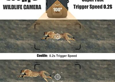 - Vitesse de déclenchement rapide -La caméra de chasse coolife a une vitesse de déclenchement de 0,2 seconde, ce qui garantit une détection rapide et précise de tout mouvement. La caméra de chasse également équipée d’un angle de couverture de 90° pour une bonne visibilité. (Veuillez ne pas mélanger les anciennes et les nouvelles piles)