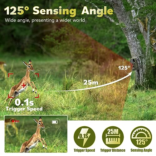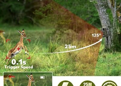 - Large Champ de Vision de 125° – Dotée d’un objectif grand-angle impressionnant de 125°, notre caméra de chasse noctur neoffre un champ de vision étendu, vous permettant de capturer des scènes plus vastes. Que ce soit dans les bois ou sur les plaines ouvertes, vous pouvez enregistrer sans effort des moments captivants sans manquer de détails importants