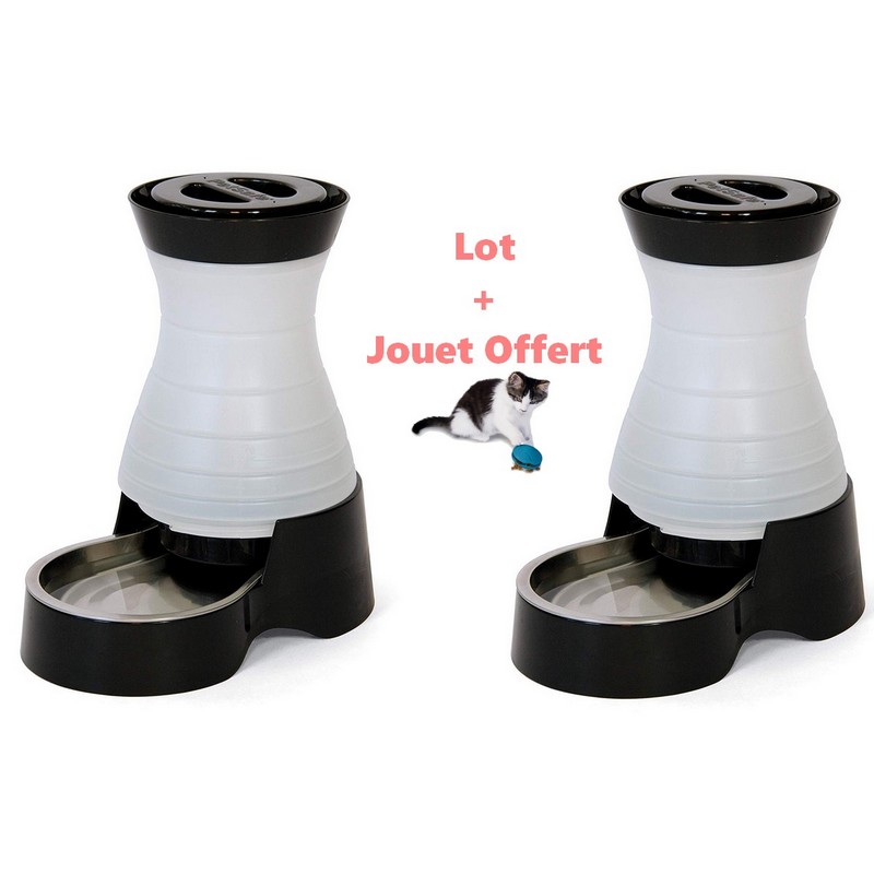 Lot de deux distributeurs Eau & Croquette Chien Ou chat Avec jouet Offert Fontaine à Eau pour Chat et distributeur de croquettes en même temps. Ce distributeur d’eau permettra de se désaltérer avec de l’eau, quand ils en ont envie. Vous n’avez pas besoin ni de piles, ni de courant. Elle conviendra en déplacement et voyage également.