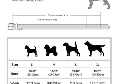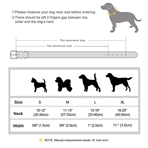 - ATTENTION AUX TAILLES:Le collier peut être un peu serré parce qu’il a un rembourrage doux,alors assurez-vous de mesurer la taille du cou de votre chien en laissant un espace de deux doigts,et vérifiez soigneusement le tableau des tailles,puis choisissez la bonne taille pour vos bébés.Si vous êtes entre deux tailles,choisissez la taille supérieure.Convient pour Chihuahua,Berger allemand,Terriers,Pitbull,Caniche,Shiba Inu,Husky, Boxer,Carlin,Labrador Retriever,Golden Retriever,etc.