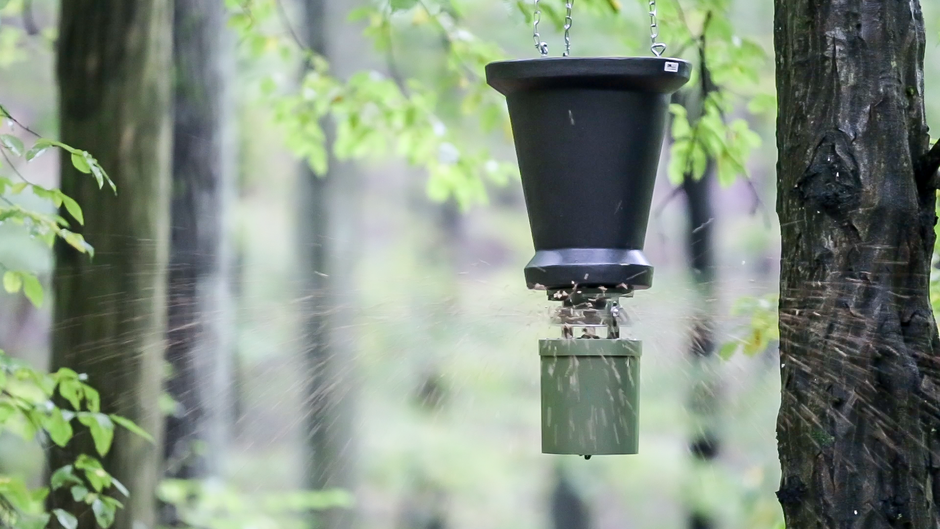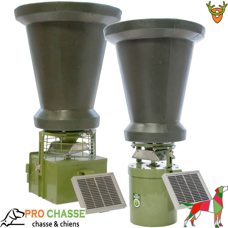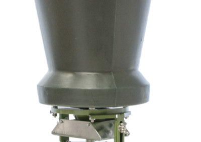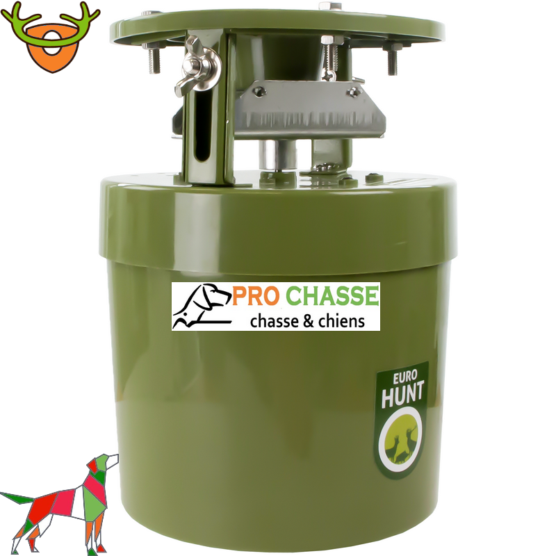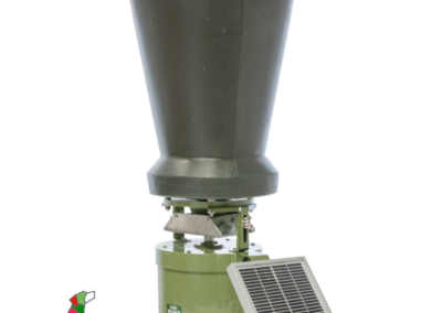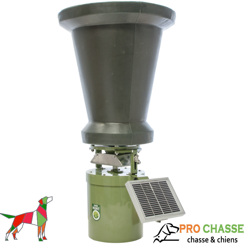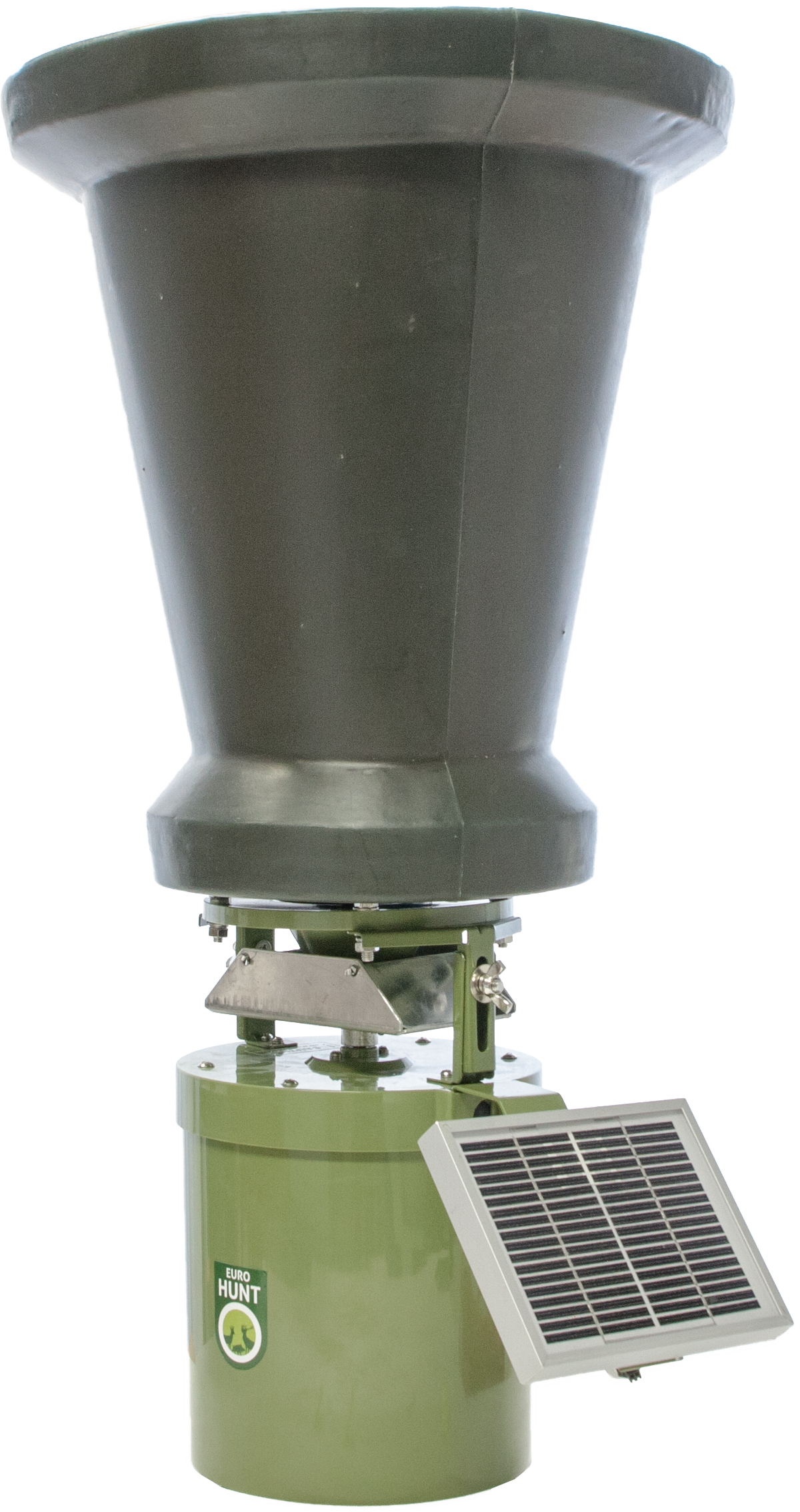Épandeur d’aliments pour animaux sauvages avec boîtier résistant aux intempéries, contrôlé par horloge numérique, distribution (1 à 6 fois par jour), librement programmable, quantité d’aliments (1 à 60 secondes par distribution) programmable, puissance du moteur réglable entre 100%, 75% et 50%, fonctionnement 24 heures (am, pm) Hauteur environ 22.5cm  – Diamètre environ 14.5cm