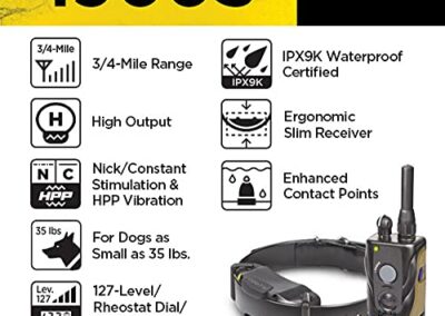 - Caractéristiques avancées : portée jusqu’à 4,4 km, collier et récepteur ergonomiques entièrement étanches, 127 niveaux d’entraînement allant de faible à élevé, momentané, unique, constant et système de vibration HPP (High Performance Pager). Le système de dressage Dogtra de pointe garantit un minimum d’interférences avec d’autres appareils électroniques.