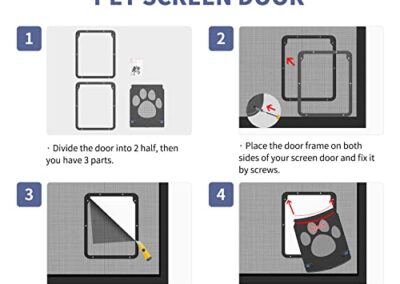 - Installez uniquement cette porte pour animal de compagnie sur la porte moustiquaire, la fenêtre et toute autre zone de moustiquaire, ne peut pas être utilisée pour les portes en bois très épaisses, les portes en fer/aluminium, les murs. Manuel d’installation inclus (français non garanti), facile à installer.