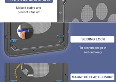 - Le cadre de porte magnétique peut continuer à fermer automatiquement lorsque votre chien ou chat glisse la porte moustiquaire, même vous pouvez verrouiller la porte par le verrou bleu à 2 côtés si vous souhaitez empêcher vos animaux de compagnie de marcher librement.