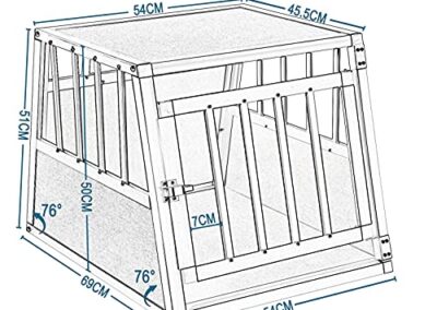- Structure Trapézoïdale : La caisse transport chien mesure 50cm de haut. Elle a un toit de 69x54cm et une base de 54×45,5cm. Les côtés sont inclinés à 76° au front et au dos. Sous une forme trapézoïdale, elle peut mieux s’adapter au coffre de véhicule