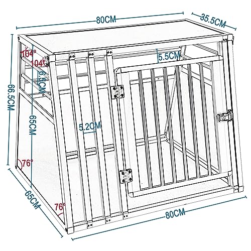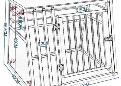 - Dimesion et Matériaux : Hauteur 65 cm ; Base 65×80 cm; Toit 80×35,5 cm, Angle d’inclinaison : 76°. En aluminium et en MDF, la cage chien est étanche, résistante, légère et transportable. Pour le nettoyer, un chiffon humide est suffisant