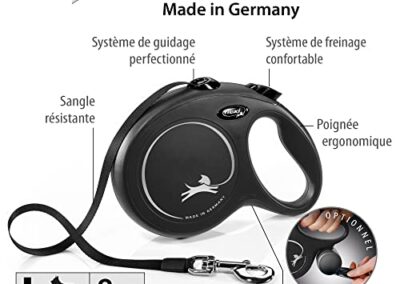 - Poignée ergonomique : La laisse « New Classic » version sangle est conçue avec une poignée ergonomique pour une prise en main confortable pendant les promenades. La poignée offre un contrôle ferme et vous permet de guider votre chien en toute confiance. Laisse sangle de 5 m, Pour des chiens jusqu’à 50 kg, Système de freinage confortable