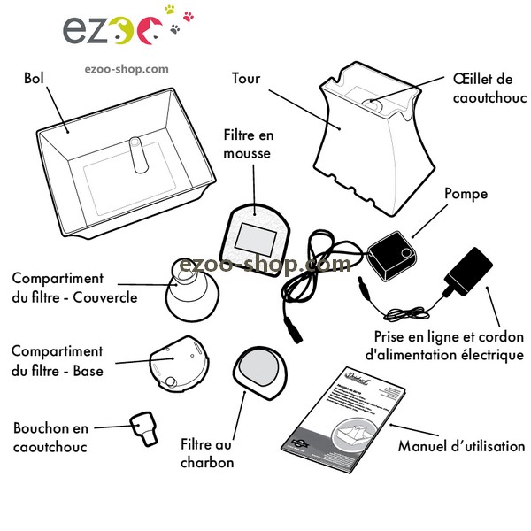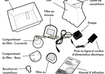 - Le système inclut : – Bol – Tour – Manuel d’utilisation – Compartiment du filtre – Filtre au charbon – Filtre en mousse – Pompe – Adaptateur – Bouchon en caoutchouc – œillet en caoutchouc (pré-installé)