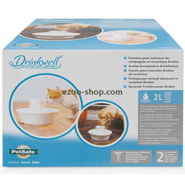 La fontaine céramique pour animaux de compagnie ‘Avalon‘ Drinkwell de PetSafe est très pratique, solide et résistante. Elle est idéale pour chat et chien de toute taille. C’est une fontaine qui facilite l’éducation de votre animal. Elle fournit 2 litres d’eau filtrés et fraîche aux chien et chats. Elle est d’une forme circulaire et une couleur blanche adaptable aux animaux de toutes tailles. Son design moderne et raffiné s’adapte aisément à l’intérieur de la maison ou de l’appartement.