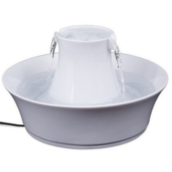 La fontaine à eau en céramique de PetSafe Avalon, est une fontaine à eau qui fournit 2 litres d’eau filtrés et fraîche aux chien et chats. Elle pèse 3,54 kilogrammes. Ce bol d’eau offre deux cascades d’eau en hauteur pour le chien ou le chat. Elle est d’une forme circulaire et une couleur blanche adaptable aux animaux de toutes tailles. Le design moderne et raffiné de cette fontaine s’adapte aisément à l’intérieur de la maison ou de l’appartement.