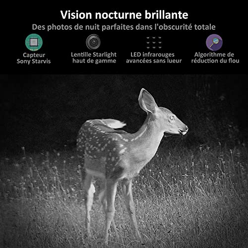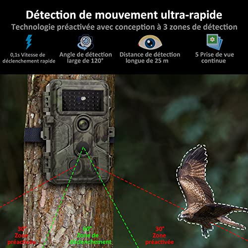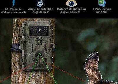 - Détection de Mouvement Rapide: Avec 3 capteurs infrarouges passifs et une technologie de pré-activation, cette caméra de chasse déclenche en 0,1 seconde. Avec une distance de détection allant jusqu’à 27 mètres et une fonction de prise de vue en continu jusqu’à 5 images, vous pouvez capturer plus de moments merveilleux.