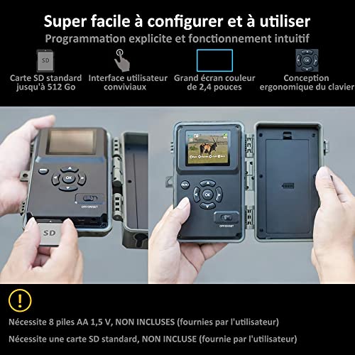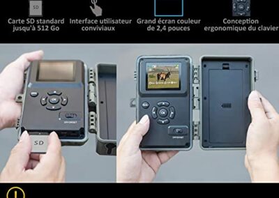 - Conception Conviviale: Cette caméra de chasse dispose de boutons de fonctionnement de style télécommande TV et d’un écran couleur haute résolution de 2,4 « , ce qui la rend facile à configurer et à lire. Elle accepte une carte SD standard jusqu’à 512 Go (carte SD non incluse).
