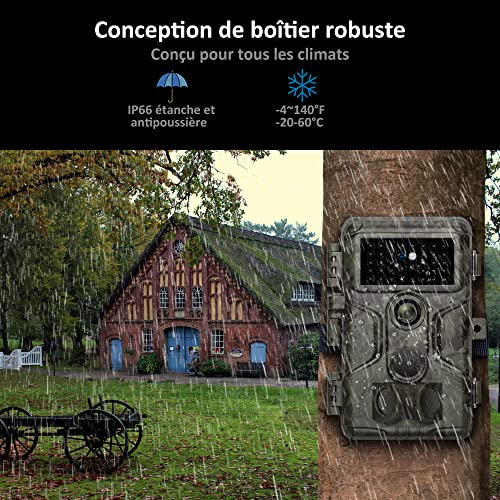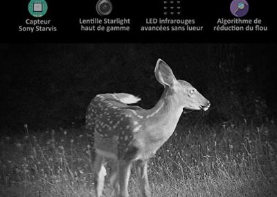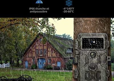 - Fonctionnalités Polyvalentes: Cette caméra offre plusieurs modes de capture (photo, vidéo, photo + vidéo), time lapse, heures de fonctionnement programmables, bande d’informations, enregistrement en boucle, protection par mot de passe, longue durée de veille et une cote d’étanchéité IP66. Elle offre une expérience confortable et pratique.