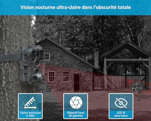 - 【30m de Vision Nocturne Ultra Longue】 Intégrant 36 pièces noires No Glow 940nm LED, la caméra offre une portée de vision nocturne jusqu’à 30m et une distance de déclenchement jusqu’à 27m, dès que les cibles entrent dans le champ de détection, la caméra de chasse commence à enregistrer tranquillement et n’effraie pas les animaux. La technologie d’éclairage adaptatif peut également éviter la surexposition ou la sur-obscurité.