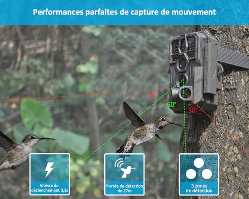 - 【Temps de Déclenchement Lightning 0,1s】 En 0,1s, le piège photo peut détecter et enregistrer tout mouvement rapide ou animal sauvage grâce à 3 PIR ultra-haute sensibilité avec un angle de détection large de 120°. La sensibilité PIR à 3 niveaux réglable de manière intelligente vous permet de filmer parfaitement dans une grande variété d’environnements de température complexes.