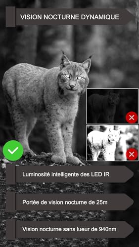 • Champ de vision étendu et vision nocturne dynamique : L’objectif optique avec un angle de vision large de 110° capture un champ de vision plus large pour la faune, assurant une mise au point claire sur des cibles aussi proches que 1,5 mètre. Les algorithmes de vision nocturne intelligents maintiennent la luminosité dynamique des LED IR, réalisant une vision nocturne équilibrée et évitant la surexposition ou la sous-exposition.