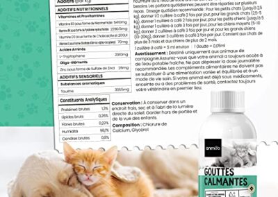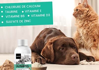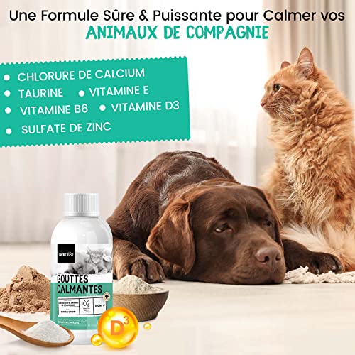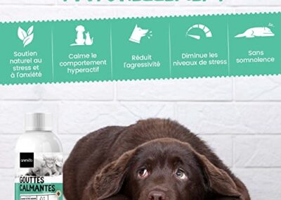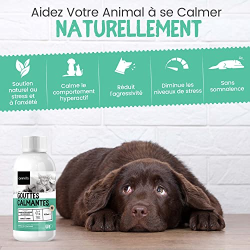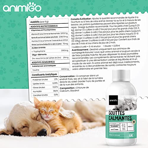 - POURQUOI CHOISIR NOS GOUTTES ANTI STRESS CHIEN ? Animigo a formulé des gouttes anti stress pour chien et chat de 100ml contenant du L-Tryptophane, un acide aminé qui aide à produire de la sérotonine (l’hormone du bonheur). Notre calmant pour chien est enrichi en vitamines pour aider votre animal à contrôler ses émotions sur une longue durée.