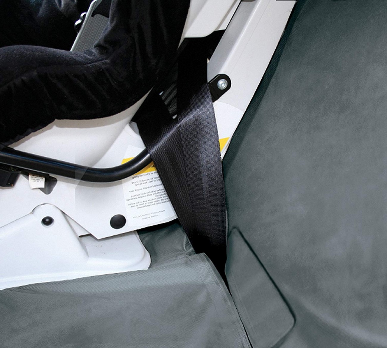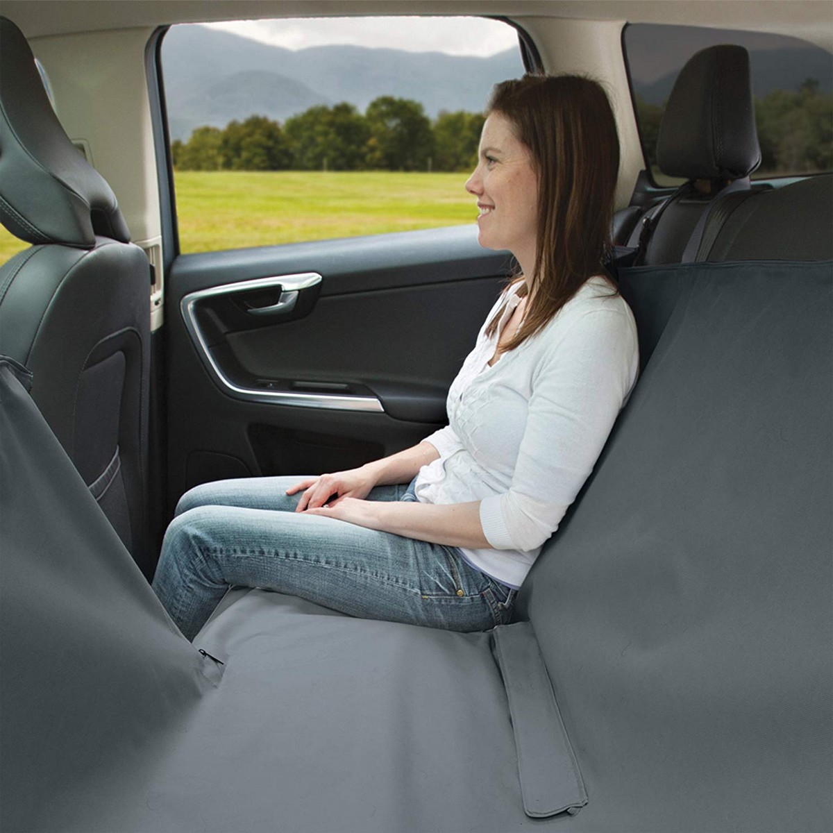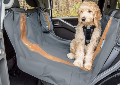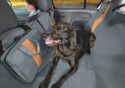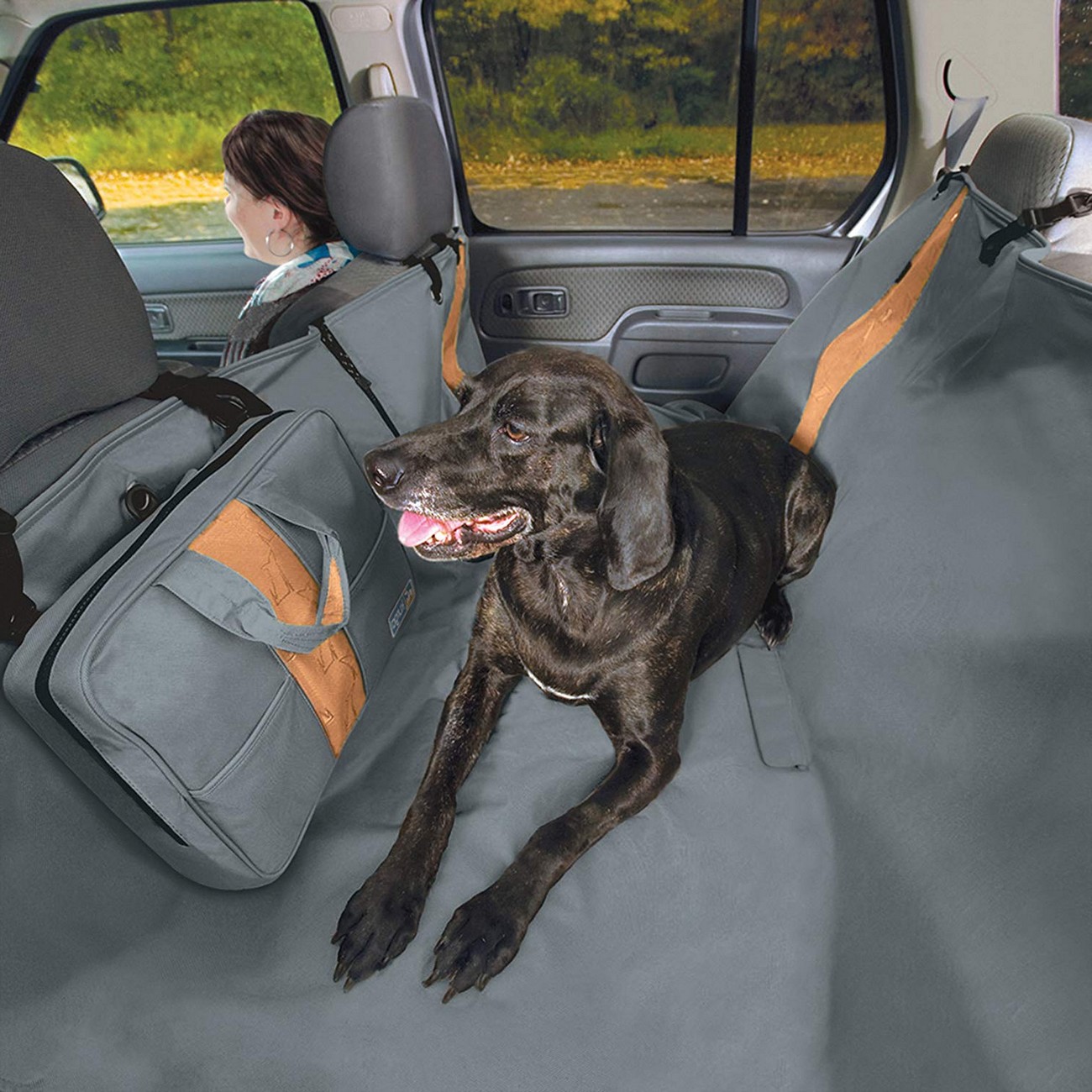 - Fermeture zippée centrale pour permettre à un passager de s’asseoir sur la banquette arrière avec le chien, Ouvertures dissimulées pour ceintures de sécurité, sangles d’attache pour chien et crochets d’ancrage pour siège enfant, Coutures résistantes, Sac de transport assorti inclus