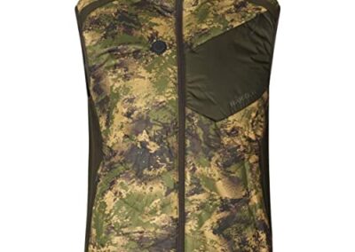- Lined, camouflaged waistcoat with a high collar and built-in heating membranes that you can set to exactly the temperature you desire.