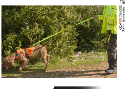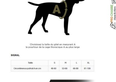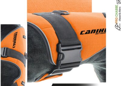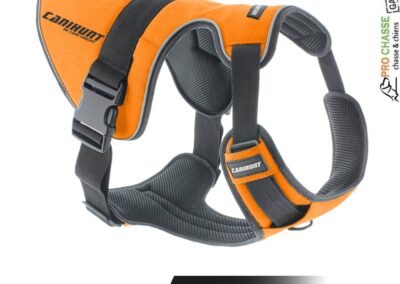 Le Harnais SIGNAL est de couleur orange fluo afin de permettre une visualisation rapide du chien en zone de chasse. Il intègre également un liseré réfléchissant afin que le chien reste visible en cas de faible luminosité.