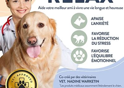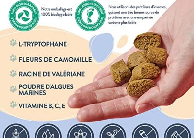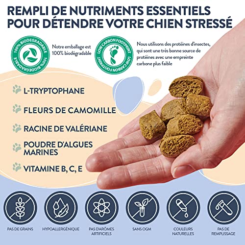 - AIDEZ VOTRE CHIEN À SE DÉTENDRE – Ces compléments contiennent du tryptophane, de la racine de valériane et de la camomille pour aider à apaiser votre chien quand il est stressé, mal à l’aise ou agité.